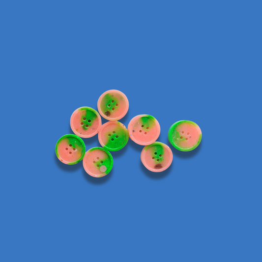 Handgjorda plastknappar med fina färger i olika storlekar. Helt unika, hållbara och praktiska.