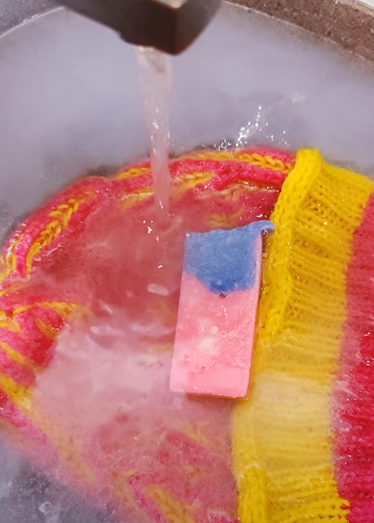 Stryk tvålbilten direkt mot fläckar eller smutsigare områden. Massera in skummet i plagget med händerna. Skölj ur ordentligt och krama ur sköljvattnet med händerna.