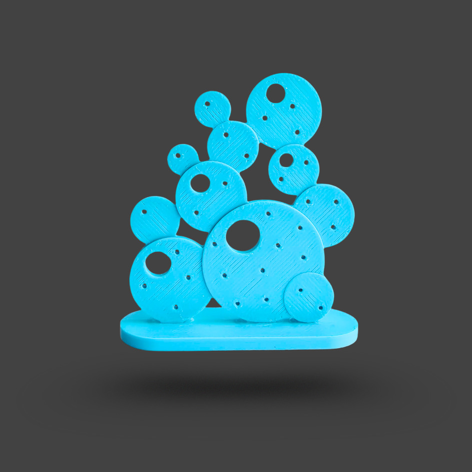 En liten hållare i fina färger till dina pluttiga stiftörhängen. Egen design, printad i min 3D-skrivare i nedbrytbar PLA-plast. 28 stiftörhängen får plats. Du kan förstås hänga andra sorters örhängen och ringar på den också.