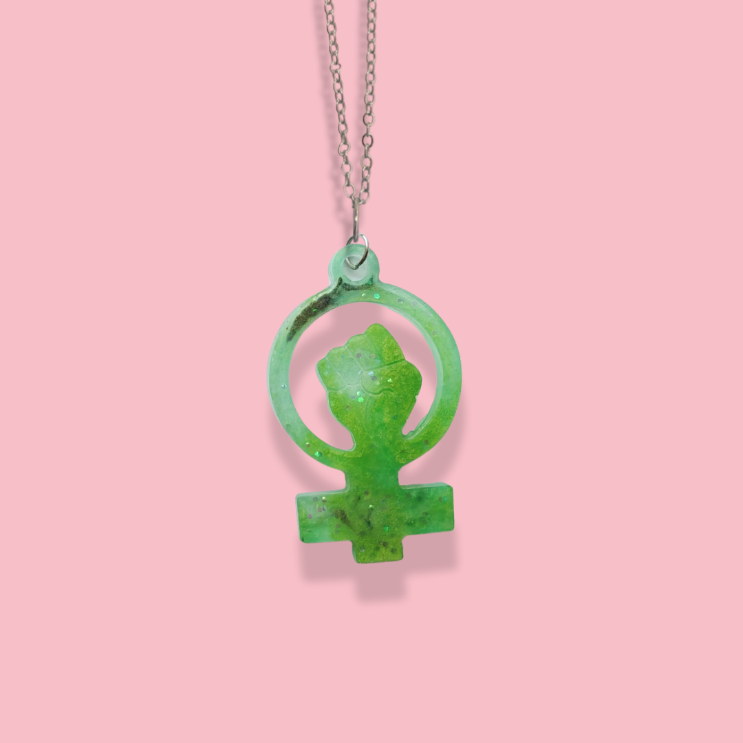 Handgjort och färgglatt smycke med kvinnotecken och knuten näve på kedja i rostfritt stål eller nylonband.