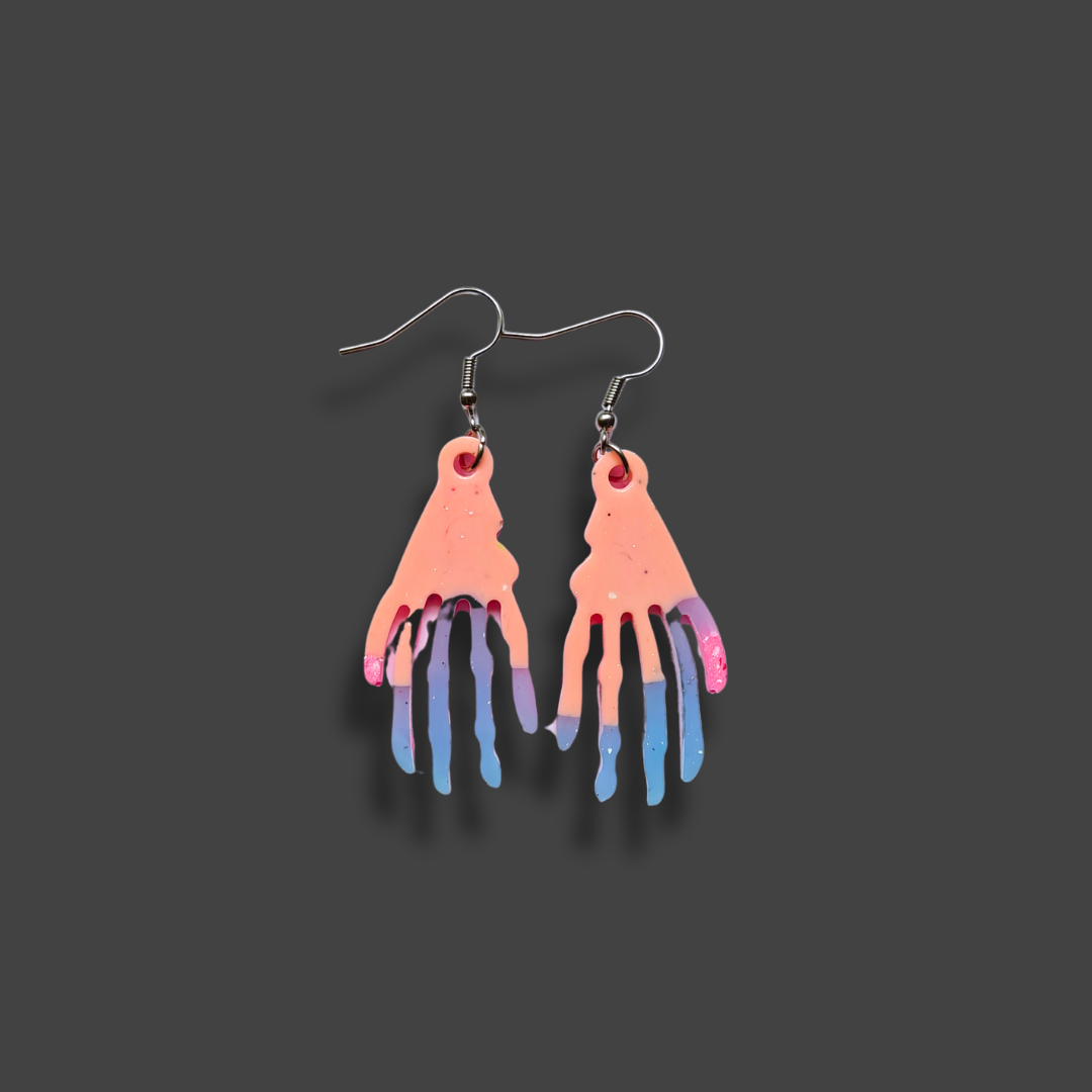 Handgjorda örhängen i plast som jag designar, färgar, gjuter, slipar och monterar. De väger nästan ingenting och gör dig tuff. Krokarna är i rostfritt nickelfritt stål.