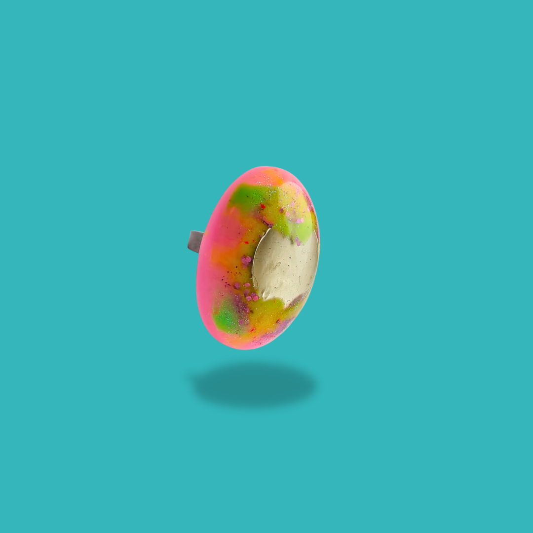 Tuff och cool, gjuten i hållbar epoxyplast med färger jag tycker om. Varje ring är unik. Den handgjorda plastdelen sitter fast på en justerbar ring i nickelfritt rostfritt stål.