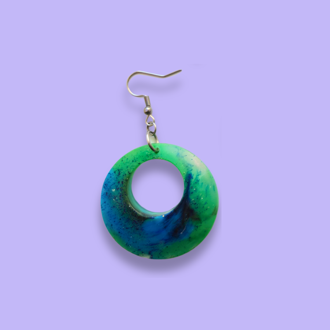 Handgjort, unikt örhänge som jag gjutit i epoxyplast med färger jag tycker om. Kroken är nickelfri i rostfritt stål. Väger nästan ingenting och gör dig tuff.