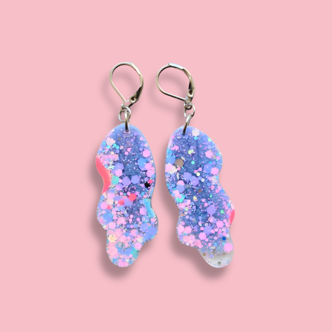 Handgjorda, unika örhängen som jag gjutit i epoxyplast med färger jag tycker om. Stiften är i nickelfritt rostfritt stål. De väger nästan ingenting och gör dig tuff.