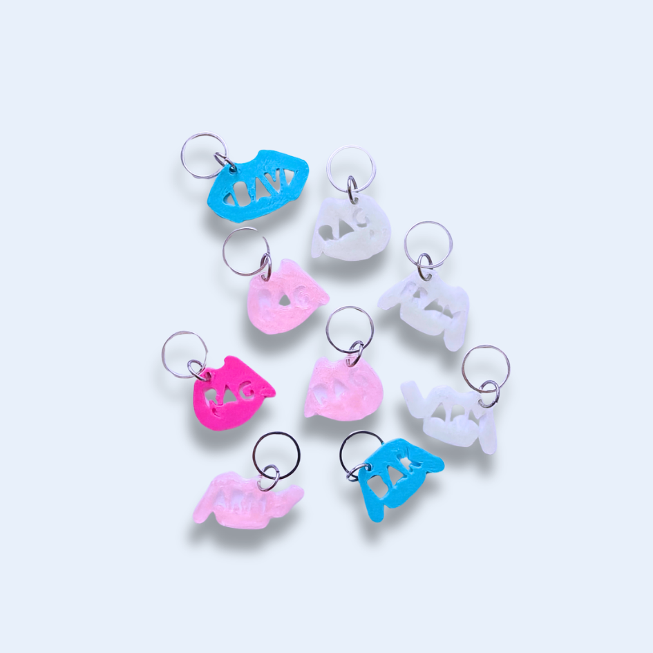 En påhittig Gunvor mailade mig och frågade om jag inte kunde designa stickmarkörer för tröjstickning. Hon skrev att hon ville "slippa tänka", och det vill verkligen jag också. Därför fixade jag såklart markörer åt Gunvor, och kanske åt dig också! Setet innehåller 9 markörer på ringar i rostfritt stål (ej öppningsbara). De vita lyser i mörker om de först laddas under lampa eller solljus.