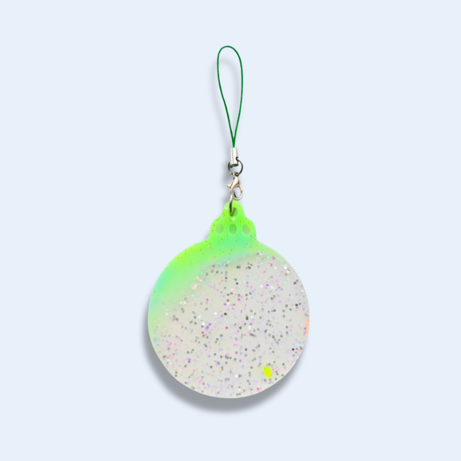 Tvådimensionell julgranskula, dimmigt genomskinlig med glitter. Helt unik, gjuten av mig i epoxyplast.