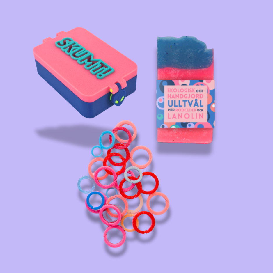 En ekologisk ulltvål, en praktisk tvålbox med rivjärn och öppningsbara lätta stickmarkörer i ett färgglatt 25-pack. En perfekt julklapp till den som stickar eller virkar i ullgarner. Jag tillverkar tvålen själv, boxen och stickmarkörer är designade av mig och printade i min 3D-skrivare.
