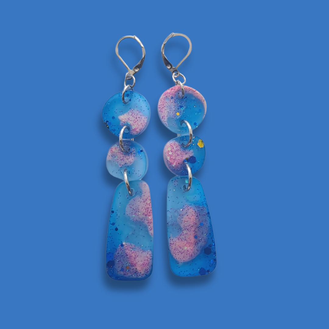Handgjorda, unika örhängen som jag gjutit i epoxyplast med färger jag tycker om. Stiften är i nickelfritt rostfritt stål. De väger nästan ingenting och gör dig tuff.