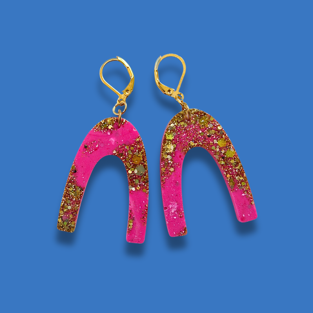 Handgjorda, unika örhängen som jag gjutit i epoxyplast med färger jag tycker om. Stiften är i nickelfritt rostfritt stål. De väger nästan ingenting och gör dig tuff.