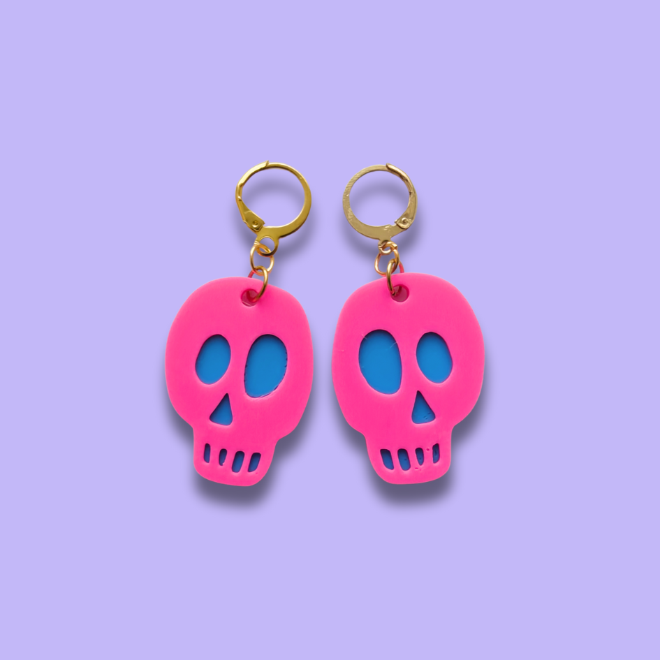 Dödskallar som bara väger något gram. Krokarna är nickelfria i rostfritt stål. Designade av mig och printade av min 3d-skrivare i nedbrytbar PLA-plast.