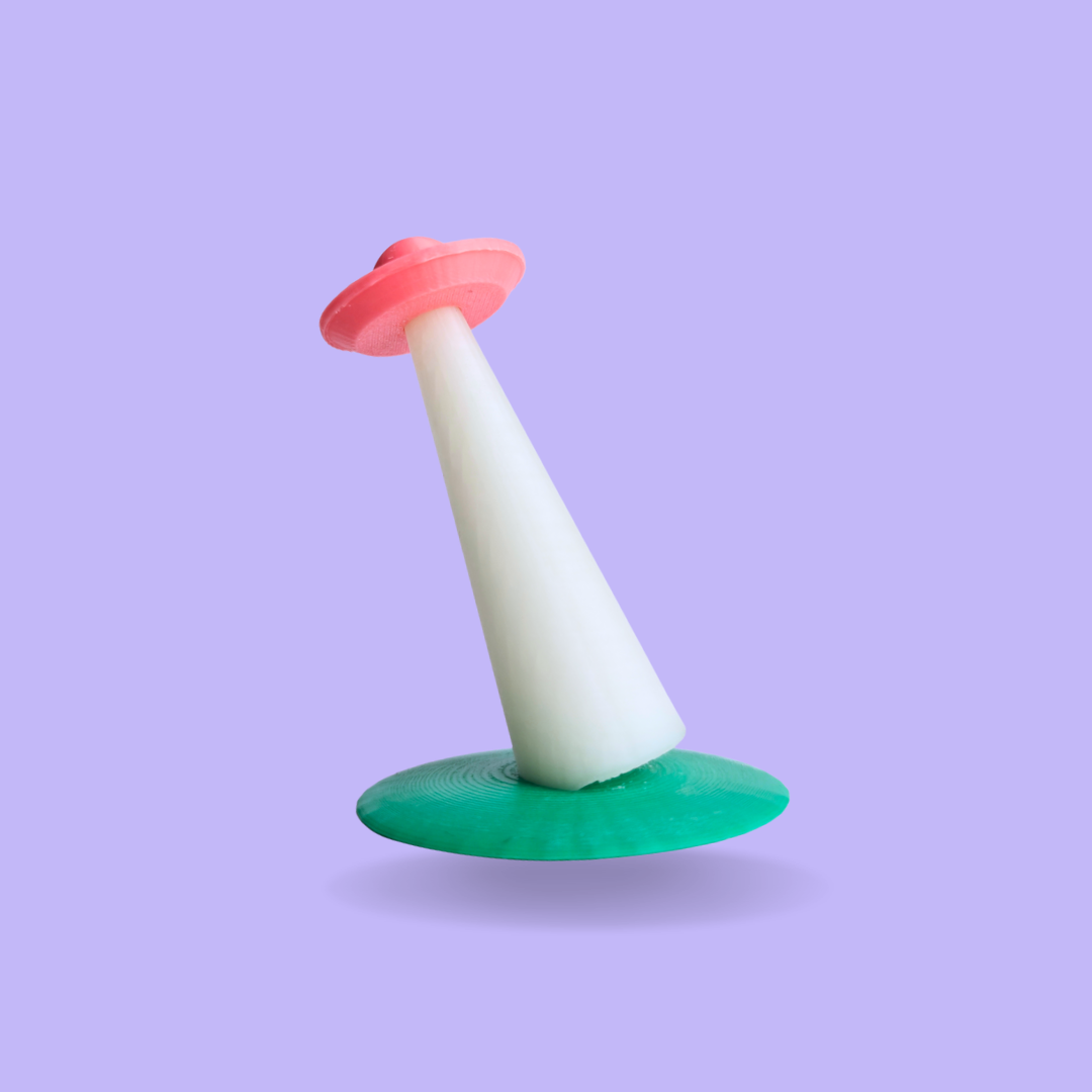 Rosa ufo med en ljusstråle som lyser grönt i mörkret. Lyft på ufot så sätter du enkelt på ringarna. Egen design, ca 10 cm hög. Materialet är PLA, nedbrytningsbar plast.