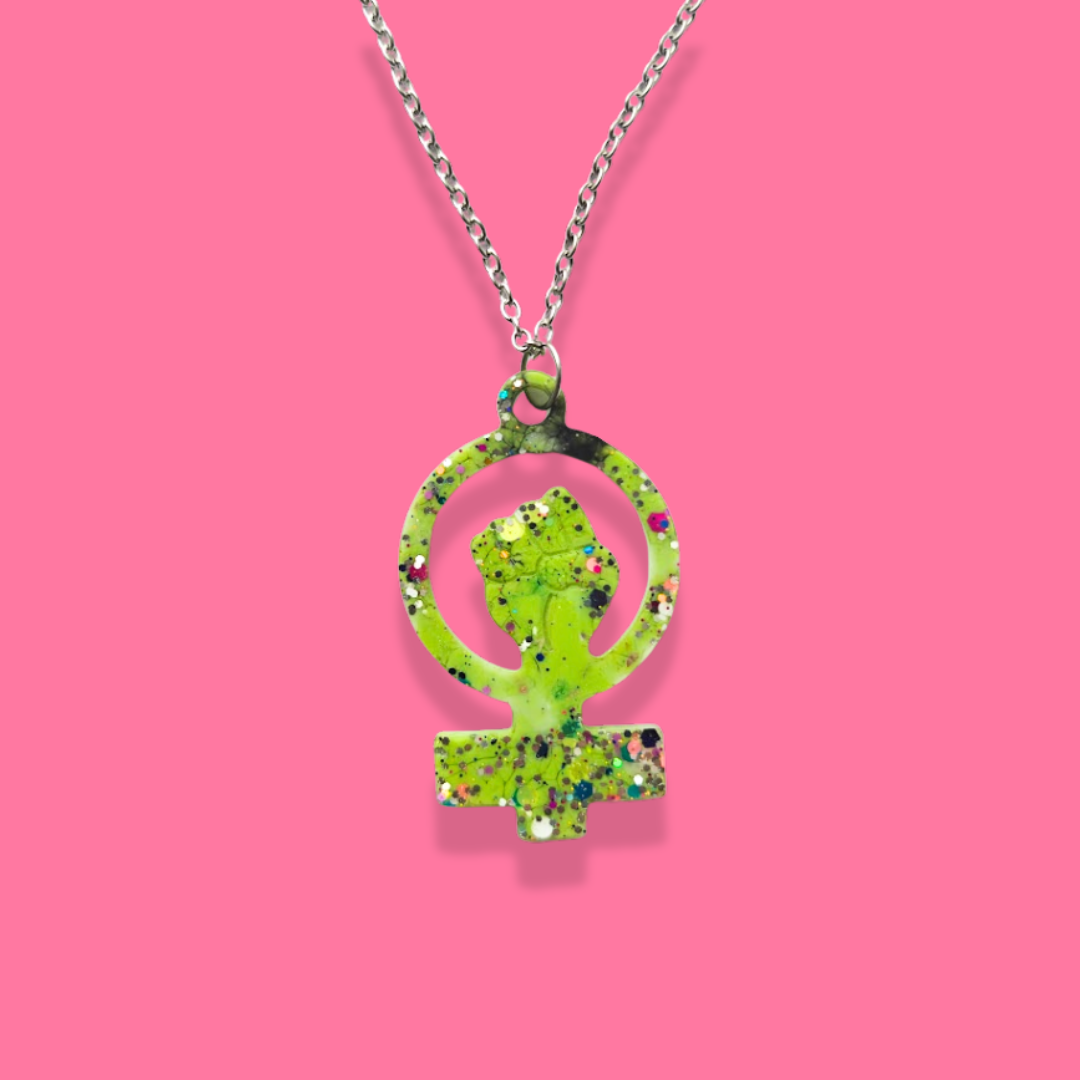 Handgjort och färgglatt smycke med kvinnotecken och knuten näve på kedja i rostfritt stål eller nylonband.