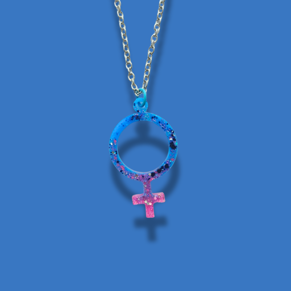 Handgjort och färgglatt smycke med kvinnotecken på kedja i rostfritt stål eller nylonband.