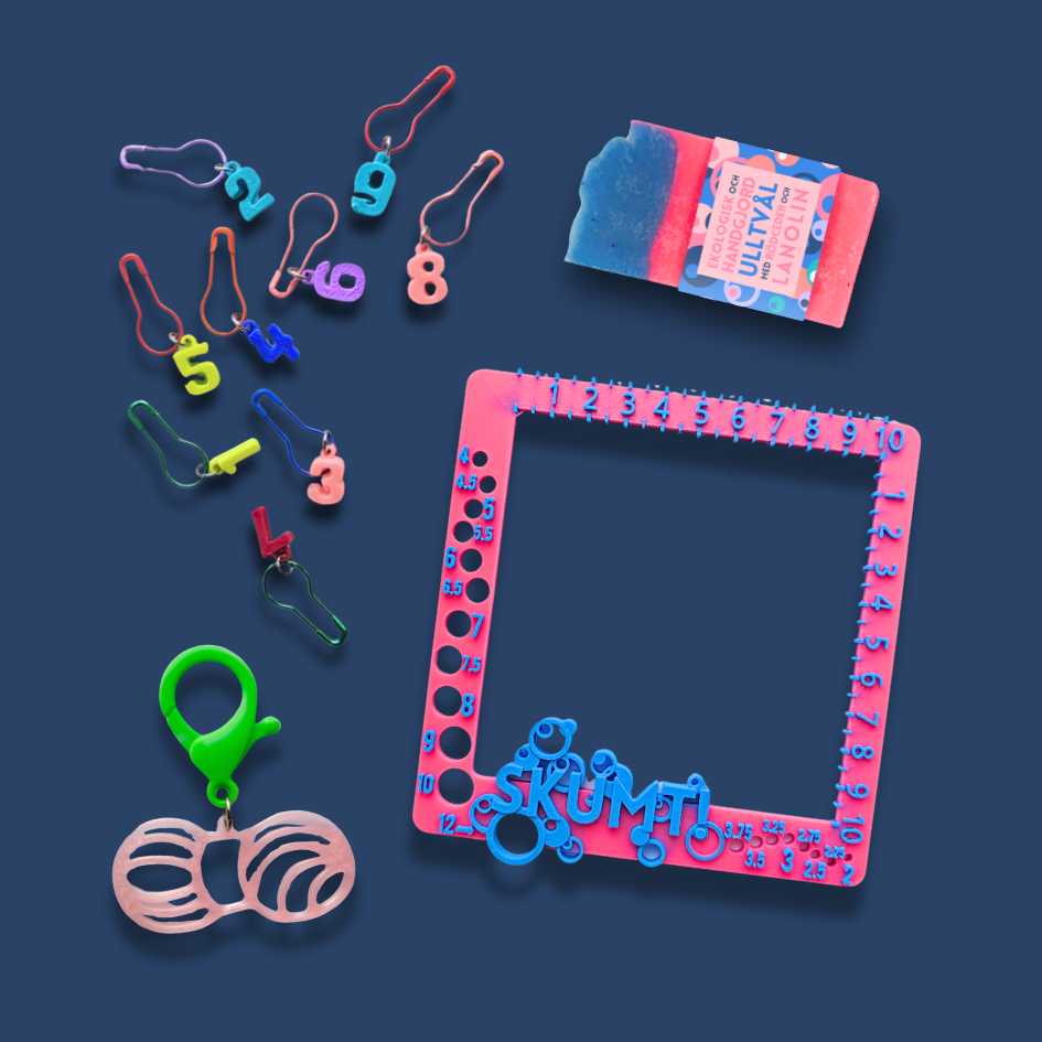 En ekologisk ulltvål, ett stickmått och öppningsbara stickmarkörer med siffrorna 1-9. Dessutom en markörkompis i form av ett nystan där markörerna kan samlas och samtidigt pryda projektpåsen. En perfekt julklapp till den som stickar eller virkar. Jag tillverkar tvålen själv. Stickmått, stickmarkörer och markörkompis är designade av mig och printade i min 3D-skrivare. Markörkompisen kan variera i färger.
