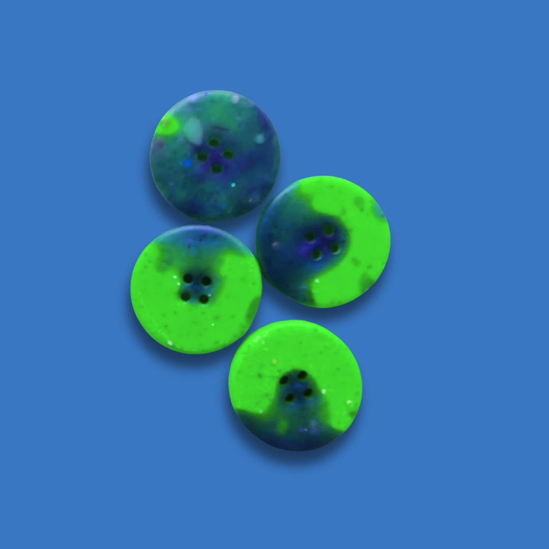 Tuffa handgjorda plastknappar, 25 mm i diameter. Hårda, hållbara och helt unika. Piffar vilken stickad kofta som helst, eller varför inte byta ut knapparna i din jacka eller favoritskjorta? Säljs som ett set.