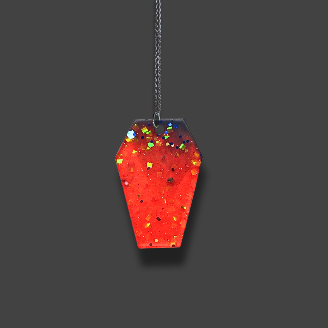 Jag tillverkar mina halsband i epoxy-resin-plast som jag gjuter och färgsätter efter humör och vad jag tycker är fint. Kedjan är i rostfritt stål.