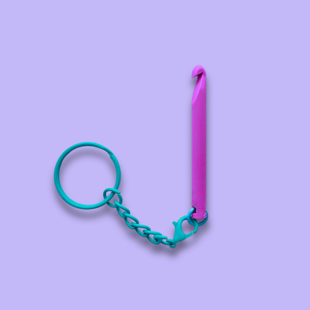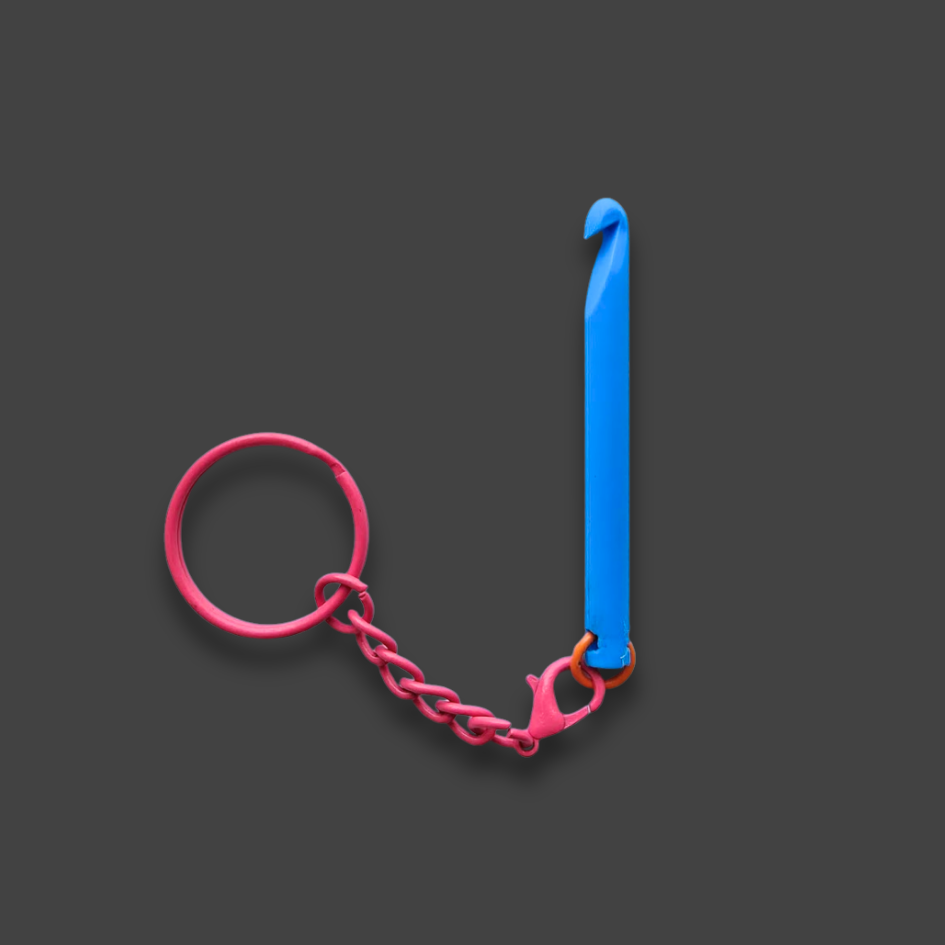 Virknålen är min egen design (storlek ca 5 mm) och jag skriver ut dem i min 3D-skrivare i nedbrytbar PLA-plast. Nyckelringen och kedjan är i färgat rostfritt stål.