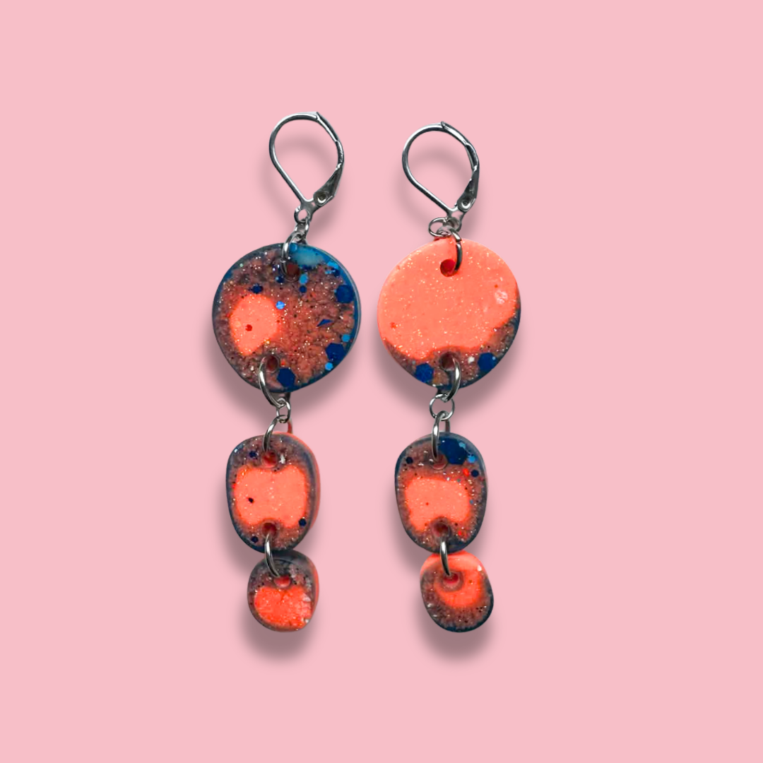 Handgjorda, unika örhängen som jag gjutit i epoxyplast med färger jag tycker om. Krokarna är i nickelfritt rostfritt stål. De väger nästan ingenting och gör dig tuff.