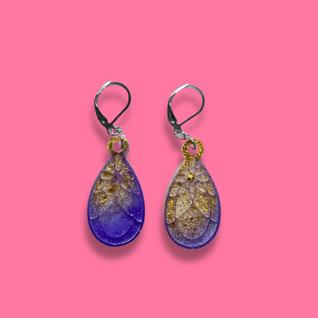 Handgjorda, unika örhängen som jag gjutit i epoxyplast med färger jag tycker om. Krokarna är i nickelfritt rostfritt stål. De väger nästan ingenting och gör dig tuff.