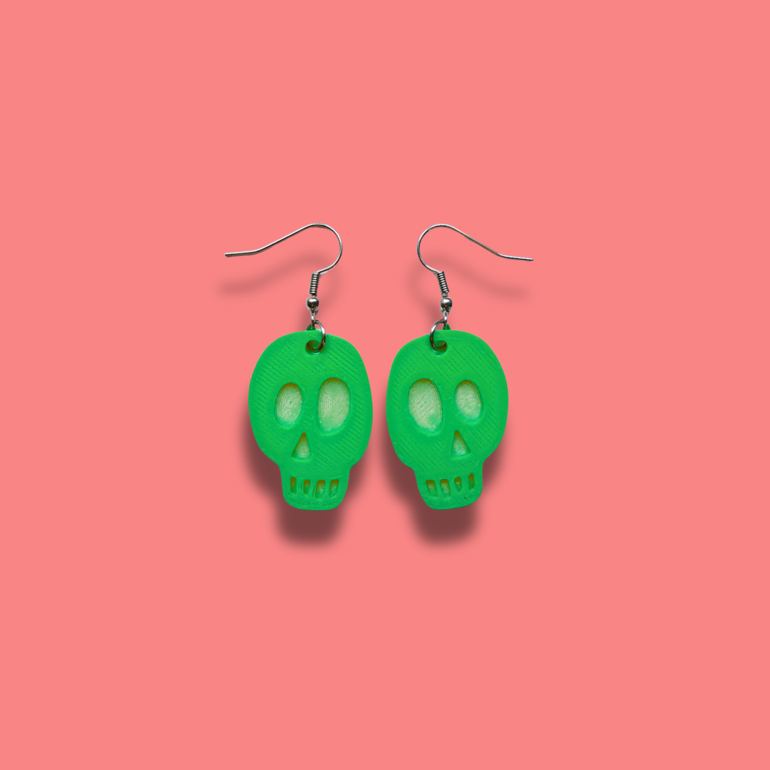 Dödskallar som bara väger något gram. Krokarna är nickelfria i rostfritt stål. Designade av mig och printade av min 3d-skrivare i nedbrytbar PLA-plast.