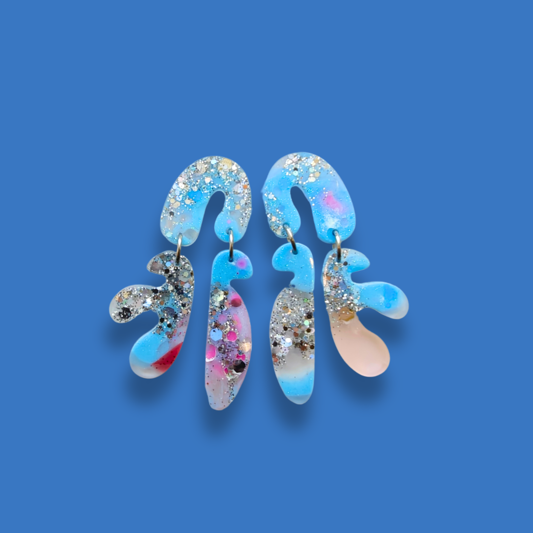 Handgjorda, unika örhängen som jag gjutit i epoxyplast med färger jag tycker om. Stiften är i nickelfritt rostfritt stål. De väger nästan ingenting och gör dig tuff.