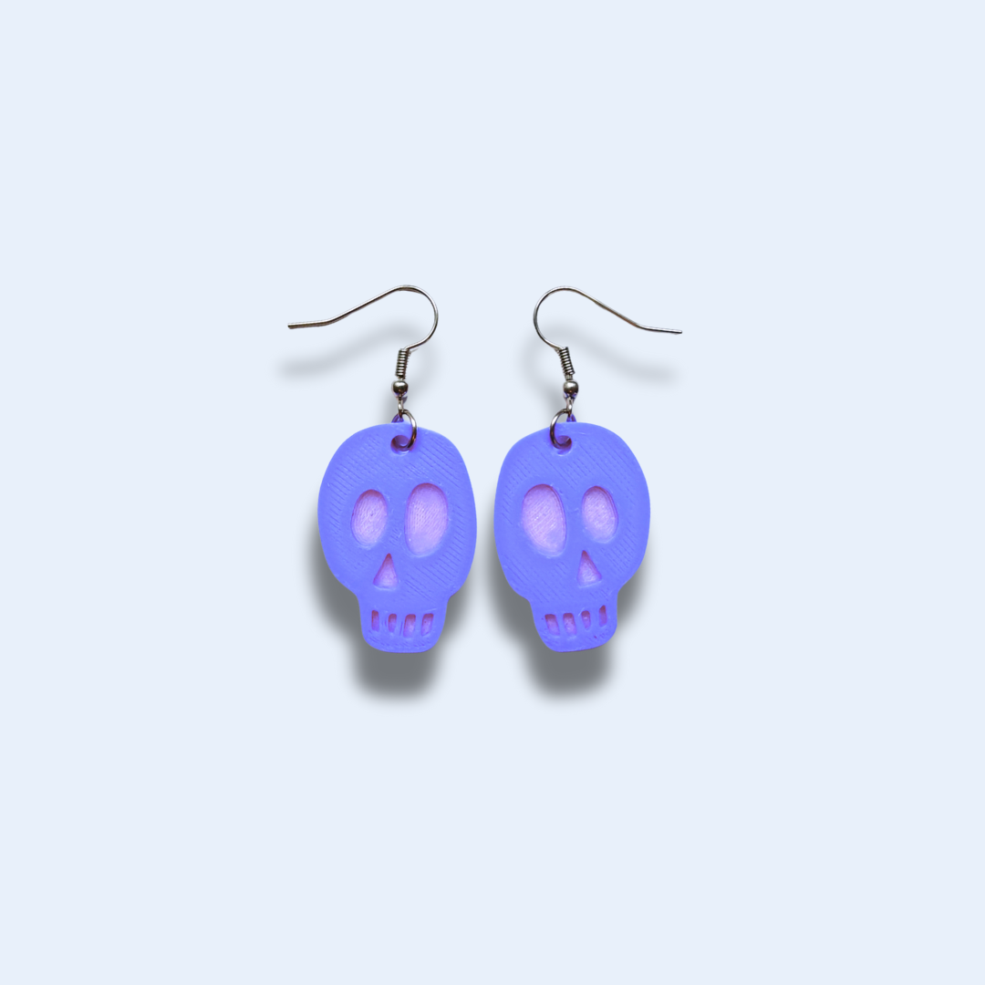 Dödskallar som bara väger något gram. Krokarna är nickelfria i rostfritt stål. Designade av mig och printade av min 3d-skrivare i nedbrytbar PLA-plast.