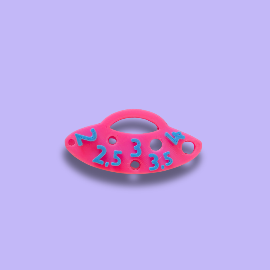 En liten ask för småsaker till handarbetet. Boxen innehåller ett litet stickmåtts-ufo som du kan mäta sticka 2-4 mm med, en nål, några stickmarkörer och en 5 cm lång linjal. Du stänger enkelt asken med alien-huvudet. Den är lätt, hållbar och smidig att ta med sig i projektpåsen. Egen design - delarna printas i min 3D-skrivare och monteras sedan ihop där det behövs.