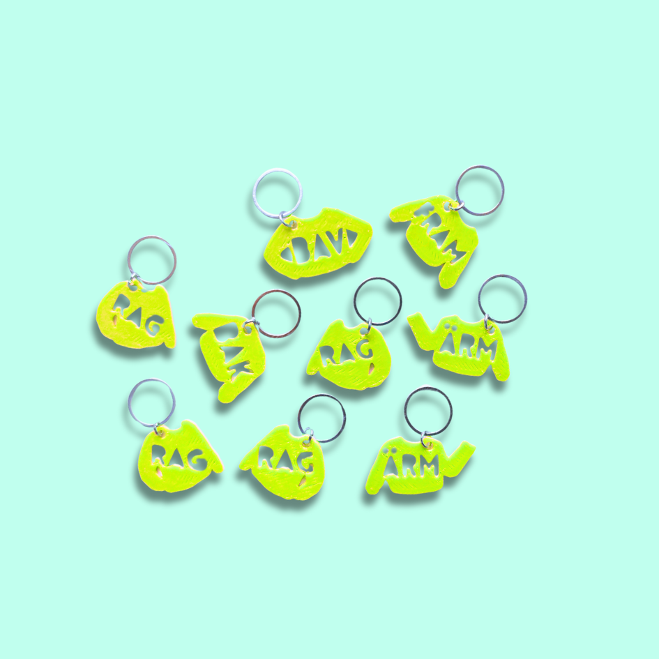 En påhittig Gunvor mailade mig och frågade om jag inte kunde designa stickmarkörer för tröjstickning. Hon skrev att hon ville "slippa tänka", och det vill verkligen jag också. Därför fixade jag såklart markörer åt Gunvor, och kanske åt dig också! Setet innehåller 9 markörer på ringar i rostfritt stål (ej öppningsbara).