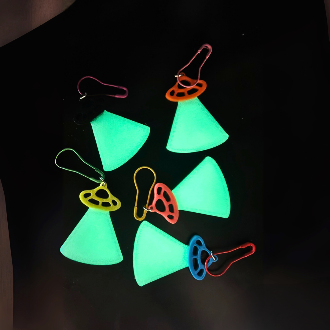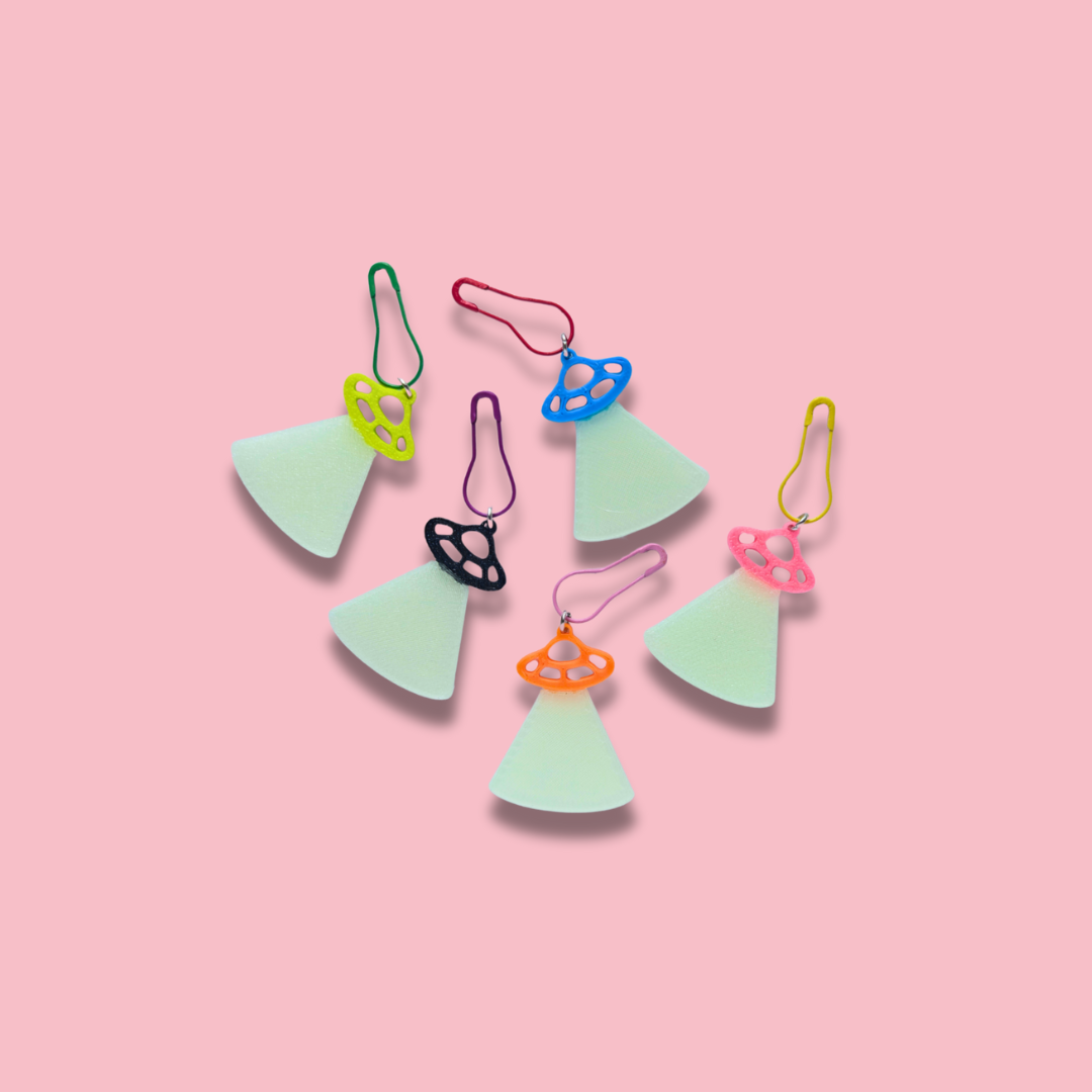 Öppningsbara stickmarkörer med superlätta, självlysande mini-ufon som gör det tydligt att det händer något i stickningen. Ljusstrålen lyser grönt i mörker om den först får "laddas" i lampa eller dagsljus. Setet innehåller fem ufon.