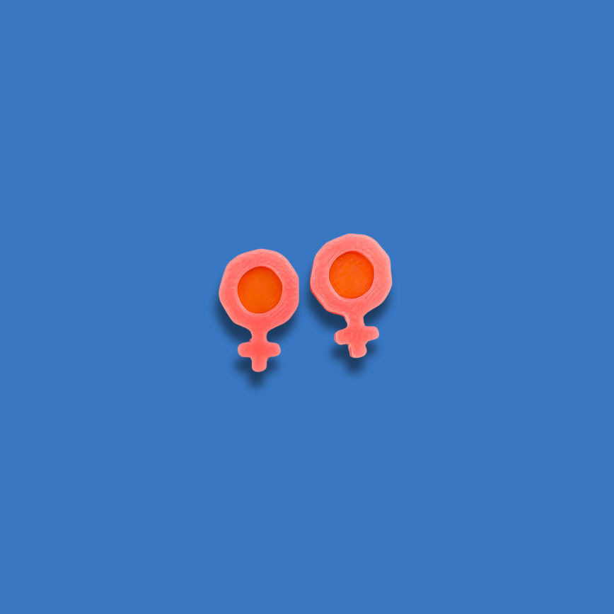 Små kvinnotecken. Egen design, utskrivna i 3d-skrivare i nedbrytbar PLA-plast. Stiften är nickelfria i rostfritt stål.